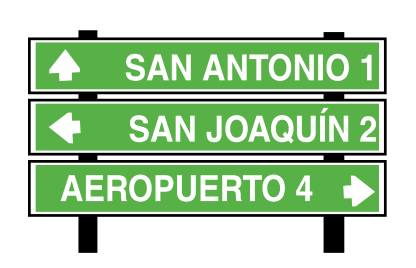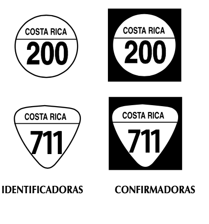 IDENTIFICACIN: Informan el nmero de la ruta por donde se transita, indicando por medio de escudos o crculos, si es una va interamericana, centroamericana, nacional primaria, secundaria o regional. Si se trata de una ruta primaria su numeracin ser del 1 al 99 y si se trata de una carretera secundaria o regional su numeracin va del 100 al 299. Si se encuentran en un recuadro negro o verde se les conoce como confirmadoras, que nos indican que nos aproximamos a la ruta indicada por si la queremos tomar y, si la encontramos con recuadro pero sin el fondo negro o verde, la seal es una identificadora de ruta que nos identifica que ya circulamos por la ruta escogida. Se reconocen tambin como rutas terciarias aquellas cuya numeracin va del 300 en adelante. Adems, de rutas cantonales que se identificarn como tales.